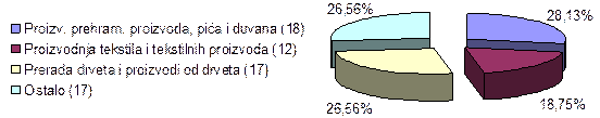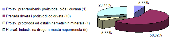 Najzastupljeniji podsektori u okviru prerađivačke industrije su prerada drveta (58,82%) i ostala prerađivačka industrija (pre svega proizvodnja nameštaja) sa 29,41%.