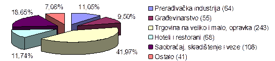 Najveće procentualno učešće u privrednim sektorima ima trgovina sa blizu 57,82% procenta od ukupno aktivnih preduzeća, zatim sledi prerađivačka industrija sa 11,56% i poljoprivreda sa 8,16%.