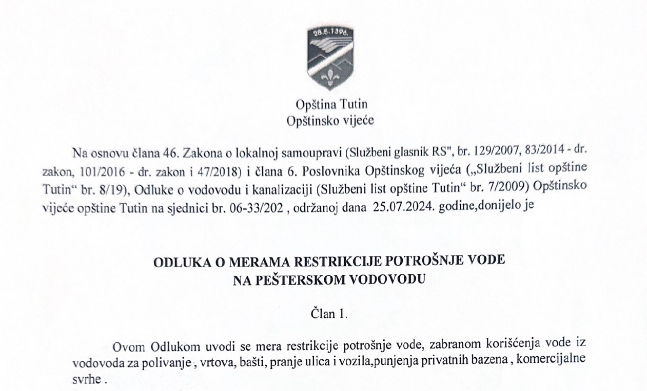 ODLUKA O MERAMA RESTRIKCIJE POTROŠNJE VODE NA PEŠTERSKOM VODOVODU 26.07.2024 Dokument možete preuzeti: OVDE TwitterFacebookPinterestGoogle+RSS Prethodni tekst Javni poziv za sufinansiranje mera energetske sanacije porodičnih kuća i stanova na teritoriji opštine Tutin za 2024. godinu Sledeći tekst Obrasci zahteva za priznavanje prava prečeg zakupa poljoprivrednog zemljišta u državnoj svojini